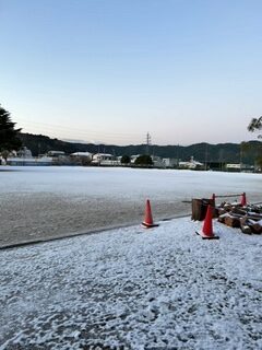 昨日のお昼過ぎから雪が降りました。小倉地区はよく降ったみたいです。この写真は、今朝の運動場の様子です。雪というより氷になっています。
