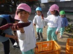 なかなか抜けない芋を前にして「手伝って」「うんとこしょ、どっこいしょ」とツルを友達と引っぱる様子や「どこにあるんだ?」「もっと掘るぞ!」と土の中にかくれているお芋を必死で見つけようとする様子が見られました。