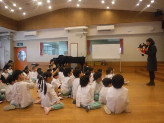 子供たちに「2学期はどんなことがあったのかな?」と聞くと「大きなカブ(発表会で行ったオペレッタ)」「遠足、楽しかった」「消防車」「〇〇君と電車をいっぱい、つなげたのが楽しかった」「いっつもいっぱい遊んだ」など、一人一人が思ったことや感じたことを思い出しながら話してくれました。