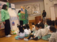 1月28日(水)「プップラジオ!プップテレビ~たのしくこうつうあんぜん~」のラジオとテレビの収録がありました。和歌山交通公園の交通安全協会の方や和歌山トヨペット、和歌山放送の方が来てくださいました。信号機の見方や横断歩道の渡り方などを教えてもらいました。道路を歩く時には右・左側どちら側を渡ったらいいでしょうか?、駐車場で遊んでいる子がいるけれどいいかな?など子供たちにクイズ形式にして、問題を出してくれました。
