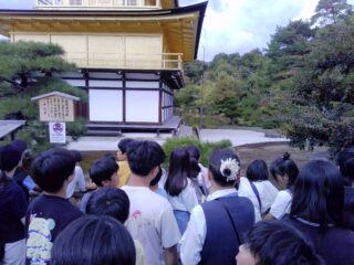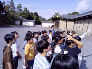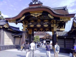 2日目の朝は二条城から。立派な唐門の前でバスガイドさんのお話を聞きます。