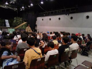 映画村でグループ行動をしたあと、寺子屋で時代劇映画のお話を伺ってから小道具をさわらせていただきました。