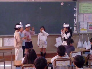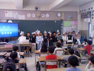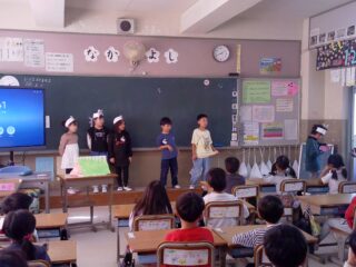 きょうは1年2くみのきょうしつに、2年1くみのおともだちがきてくれて、「ニャーゴ」のげきをみせてくれました。