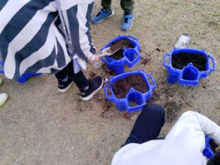 そんなチューリップのきゅうこんをじぶんたちのうえきばちに入れ、土をかけました。