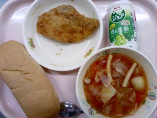 きょうのきゅうしょくは、しろみざかなのふらいと、みねすとろおねと、ぱん、じょあ でした。