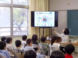 学習の一環として和歌山市役所一般廃棄物課から職員の方をお招きし、教室で和歌山市のごみ処理の現状やリサイクルについてお話をしていただきました。