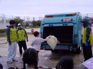 また6時間目には、集配センター北事務所の職員の方に来校していただき、実際集配業務で使用しているパッカー車を使いながら、ごみの集め方などを説明していただきました。雨降りの中、子どもたちは興味深そうにお話を聞いていました。