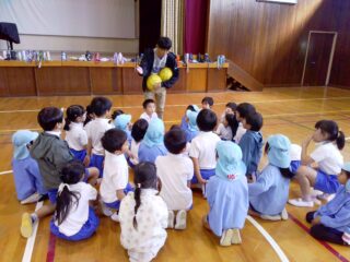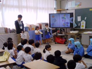 きょうは、なるかみほいくしょの年ちょうじさんが太田小学校の1年生のきょうしつにあそびにきてくれました。