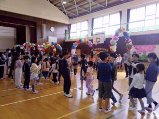 2~6年生の校歌と「勇気100%」の歌の、2曲の歌を聴いた後、6年生から手製のメダル、2年生から「あさがおのタネ」(昨年生活科で育てて取れたもの)をプレゼントしました。
