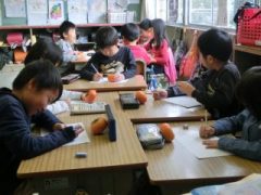 選んだ一つの果物の名前を英語でを言ったら、消しゴムを取るというゲームをしました。、ジョアン先生の声の大きさや言い方、よく似た発音もあり、あわてて消しゴムを取ってしまう子が続出!!