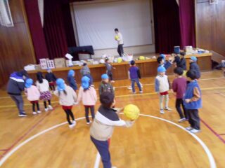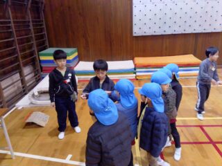 宮保育所から17人の年長児さんが来てくれたので、2年生が体育館でで迎えてくれました。