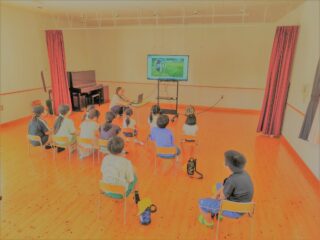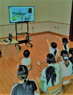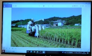 広い田んぼでの収穫の動画を、田植えを一緒にした5年生と視聴しました。
