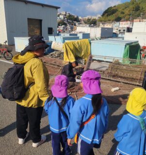 「今日は漁が休みで、船の底にペンキを塗るために陸に上げてるんよ。」