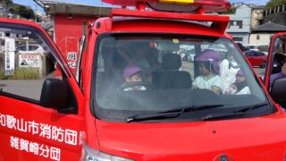 双眼鏡を覗くと、先日、園外保育に出かけた「レモンの丘」から見えた雑賀崎灯台が近くに見えました。
