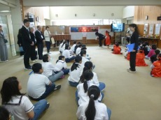 台湾防災推進校の皆さんは、図工室で避難の時の合言葉「・お(さない)・は(らない)・し(ゃべらない)・も(どらない)」の説明と地震の1次避難(運動場)津波警報発表の2次避難(高台)について説明をききました。そのあと、「地震速報受信警報システム」を使って、緊急地震放送の訓練放送を流しました。