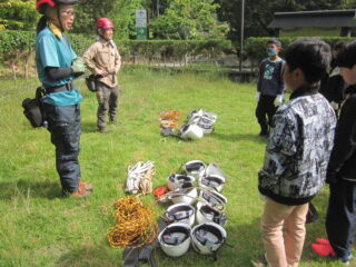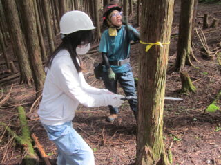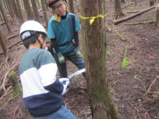 2グループに分かれて、指導を受けながら大きな木を1本切り倒しました。