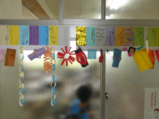 3年生の廊下側に、七夕かざりがされていました。各々が願いを短冊にこめています。