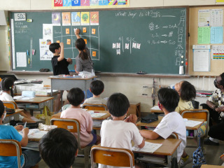 4年生は、外国語活動の時間にALTさんと一緒に「What day is it?」の学習をしました。