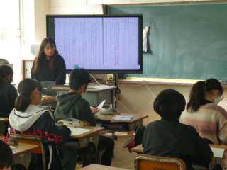 国語の時間に教科書に赤線を引く際、電子黒板に表示させた教科書に線を引いて見せています。