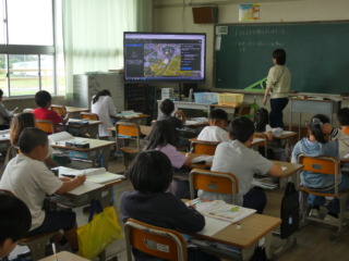 まずは、電子黒板にGoogle Earthを使って、学校周辺の様子を映し出しました。