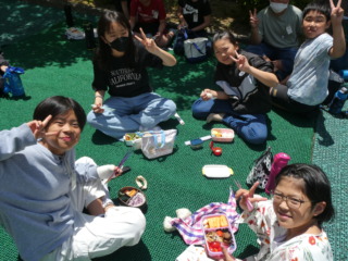 お弁当持参なので、中庭に出て食していました。楽しそうに話しながらのお弁当でした。