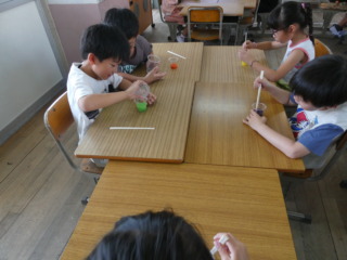 理科の時間に、ゴム輪1つから2つにしたら、車の進む距離はどう変わるか考えていきます。