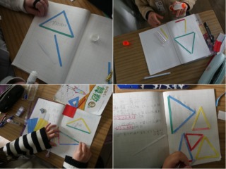 教科書の巻末にある、色のついた棒状の紙を並べて、二等辺三角形や正三角形を作っていました。
