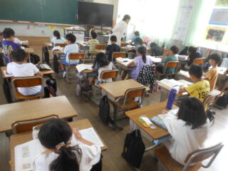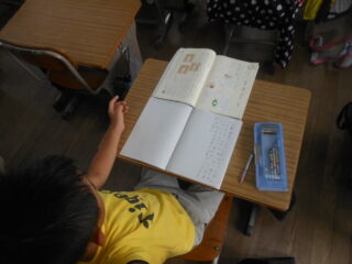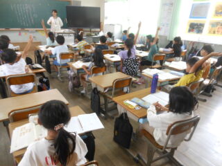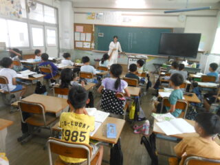 授業は「しりとり」から始まります。お題は「食べもの」。食べものだったらなんでもいいので、思いつくものをノートにたくさん書きます。「はじめ。」2分間の間に子どもたちは思いつくものをたくさん書きます。その後、みんなでノートに書いたもの限定で、しりとりをしていきます。前回は20個までつながったので、今回の目標は25個です。「いたちょこ」→「ごま」→「ましゅまろ」→「ロールケーキ」→「きのこ」→「ココナッツ」→・・・。さてつながったのは。「19個」。目標達成ならず。残念。