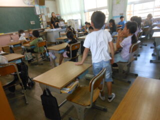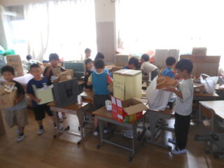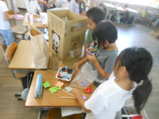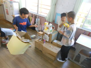 1年生に自分たちで作ったおもちゃで遊んでもらおうという活動です。射的やボーリング、空気砲やくじ引きなどなど、たくさんの遊びの場を2年生なりに作っています。今日は、自分たちで一度体験してみて、1年生にやってもらう時のために、変更しないといけないところやわかりにくいところなどを見つける活動です。2年生たちにとってはとっても楽しい活動でやる気満々です。1年生たちが楽しく、おもちゃランドで遊んでくれるのが楽しみですね。