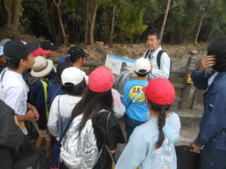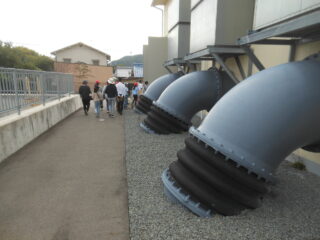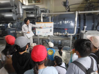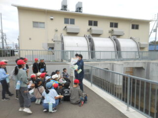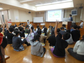 毎年5年生を対象に行われている出前授業です。近畿農政局和歌山平野の方々に来ていただきました。はじめにランチルームで食料自給率の問題や水害による被害から三田地区を守るための施策についてのお話を聞き、その後、外へ出て、名草排水路や名草排水機場を見学させていただきました。その場その場で、パネルを用意していただいており、わかりやすく説明を聞くことができました。それぞれの質問に答えてもらい、子どもたちは三田の地域にこのような施設があることを学ぶことができました。