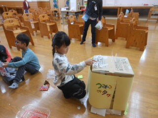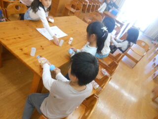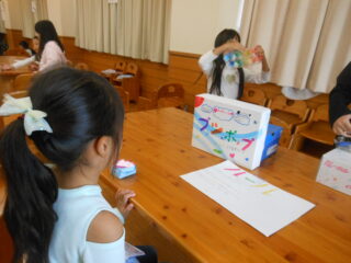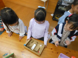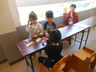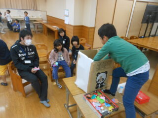 2年生が企画して準備してきたおもちゃランドの活動のクライマックスです。1年生を招待して自分たちが作ったおもちゃで遊んでもらう時間です。ランチルームに準備万端用意していよいよ1年生がやってきました。さて楽しんでくれるかな。ドキドキしながらおもちゃランドの始まりです。それぞれの遊びのコーナーで1年生たちは笑顔いっぱいで遊んでくれました。先生たちも楽しそうです。画用紙や折り紙で作った景品をいっぱいもらい、嬉しそうにおもちゃゲームに取り組む1年生をみて、2年生たちも満足そうでした。楽しいおもちゃランドをありがとう。