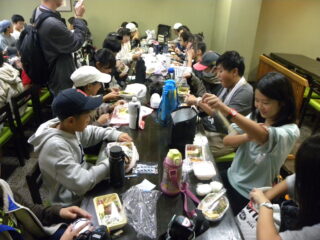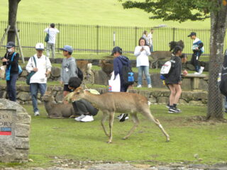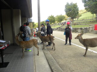 【6年生】修学旅行 1日目昼食(白銀屋) 投稿日:2025年10月27日 若草山の目の前にある白銀屋さんでお弁当を食べました。手作りのお弁当を美味しくほうばっていました。食べ終わった子からお買い物の時間です。店の外には相変わらず鹿がいっぱい。春日大社を通ってバス駐車場に向かいました。
