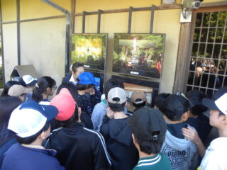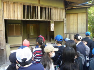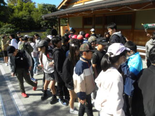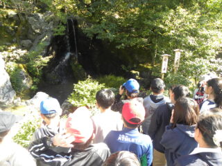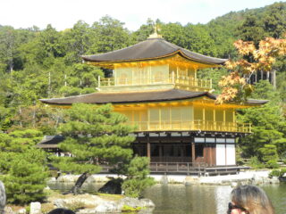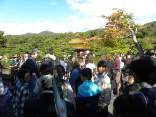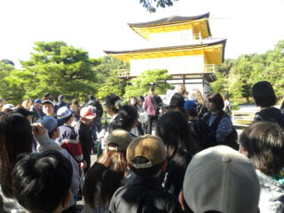 いよいよ金閣寺です。ひとつ前に見学した銀閣寺との違いを思いながらの見学です。いいお天気で太陽の日差しが金閣寺に当たり、とてもきれいに光って見えました。子どもたちはグループごとに写真撮影をしながら、その想像以上の輝きに見とれている様子でした。金閣寺の内部の写真が展示されているところでガイドさんが説明してくれ、実際に見ることはできないけれど写真を見て想像を膨らませていました。その後お庭を一周回りました。