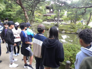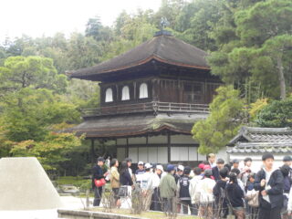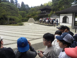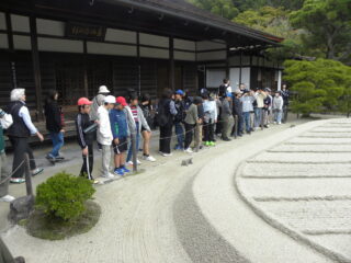 2日目最初の見学場所は銀閣寺です。修学旅行の団体では、三田小学校が朝1番だったので、かなりすいている状態での見学になりました。バスガイドさんが国宝の観音殿や東求堂、庭にある砂の向月台などについての説明をしてくれました。朝のすがすがしい空気の中、わびさびの世界を堪能できました。