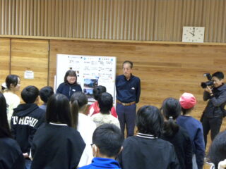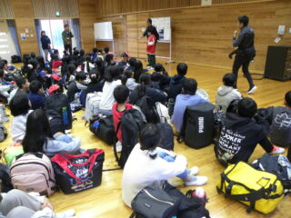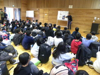 【5年生】加太合宿(入所式) 投稿日:2025年11月13日 青少年国際交流センターに着きました。はじめは入所式です。研修室という小さい体育館のようなところで行いました。挨拶の後、国際交流センターでの過ごし方やルールやマナーについても、教えてもらいました。5年生たちのワクワクさはどんどん増しています。