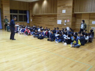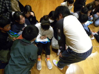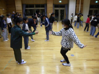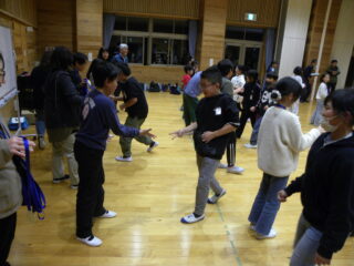 空には雲が広がっていたため、予定していた天体観測はできませんでした。代わりのプログラムとして室内オリンピックをしました。国際交流センターの方が工夫をこらしたゲームを教えてくれて、みんなで楽しみました。それに先立ちまして、キャンドルファイヤー行いました。一人ひとつのろうそくを持ち、火の神から火が移されます。キャンドルの明かりがたくさんになり幻想的な雰囲気になりました。