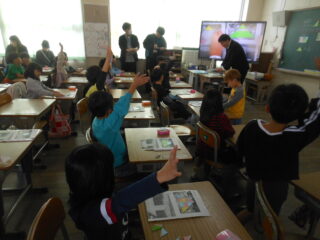 算数の図形の授業でした。三角の色板を並べて、大きい三角や家の形、山、船などの形を作っていきます。コツは、色板を「くるっと!」すること、2つ合わせて四角や大きい三角を作ること。これを使って挑戦です。1年生にとっては初めての研究授業でした。たくさんの先生に囲まれ、おどおどした表情で始まりましたが、授業が進むにつれて、自分でしっかり考えて発表もできていました。賢い1年生の姿を見ることができました。