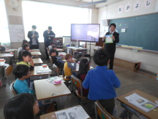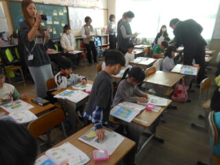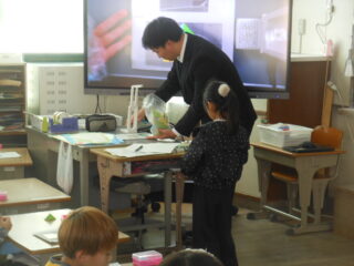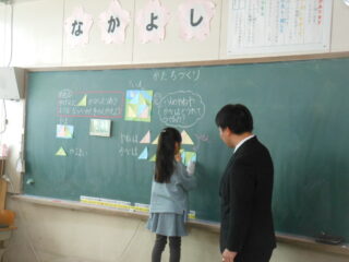 算数の図形の授業でした。三角の色板を並べて、大きい三角や家の形、山、船などの形を作っていきます。コツは、色板を「くるっと!」すること、2つ合わせて四角や大きい三角を作ること。これを使って挑戦です。1年生にとっては初めての研究授業でした。たくさんの先生に囲まれ、おどおどした表情で始まりましたが、授業が進むにつれて、自分でしっかり考えて発表もできていました。賢い1年生の姿を見ることができました。
