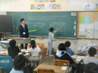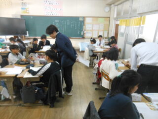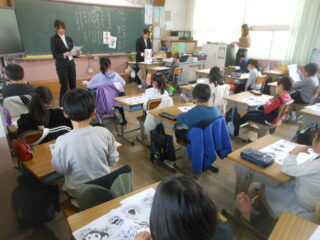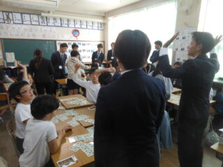 和歌山大学の学生が講義の一環として三田小学校を訪れ、子どもたちと交流し、授業も行いました。学校臨床フィールドワークという講義で20人の学生と4人の大学の先生たちが来られました。はじめに校長より、三田小学校の紹介をした後、早速授業を参観しました。給食も子どもたちと一緒にとり、昼休みも時間は短かったですが、一緒に遊びました。そして午後からはいよいよ学生さんたちが授業をする時間です。道徳や算数、図工などの授業をしてくれました。若く元気な学生さんたちがたくさん来てくれ、子どもたちは大喜び。楽しい一日を過ごしました。