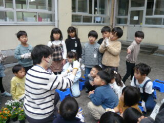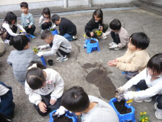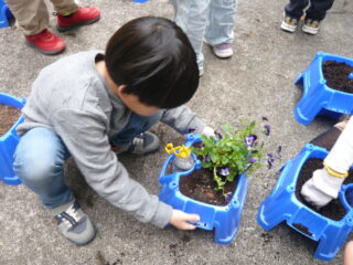 来年4月に入学してくる新入生の入学式にお花のいろどりをと、1年生たちはチューリップの球根とビオラの苗を植えました。1学期にアサガオを育てた植木鉢に上手に植えました。先生の説明をよく聞いて、ひとつひとつきれいな花が咲くように願いを込めていました。入学式には新入生やその保護者の方がこの花を見て、三田小学校の入学を喜んでくれるといいですね。