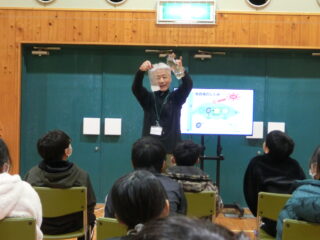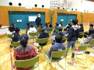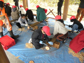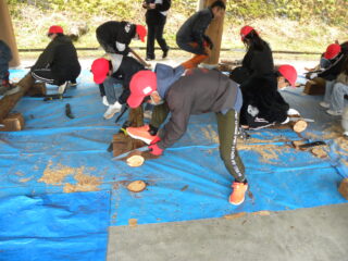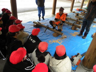 県の「紀の国緑育事業」の一環で、森林体験教室(林業体験)を行いました。紀美野町和海紀森林組合のご協力を得て、毎年5年生に行ってもらっています。紀美野町へバスで出かけ、午前は1組が体育館で木や森、林業についてビデオや実物を見ながら教えていただいているときに、2組は別の場所で実際に丸太をのこぎりで切る体験をさせてもらいました。午後からは逆になり、2組がレクチャーを受け、1組が体験させてもらいました。この日は雨模様だったので、屋根のあるところでの体験でした。それでも楽しく活動でき、のこぎりの使い方がかなり上手になりました。チェーンソーの実演も見せてもらい、5年生たちは大きな音と切るスピードに驚いていました。