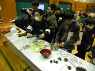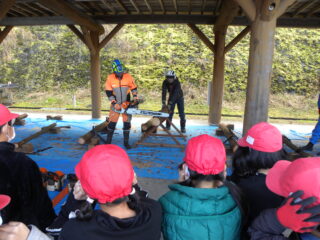 県の「紀の国緑育事業」の一環で、森林体験教室(林業体験)を行いました。紀美野町和海紀森林組合のご協力を得て、毎年5年生に行ってもらっています。紀美野町へバスで出かけ、午前は1組が体育館で木や森、林業についてビデオや実物を見ながら教えていただいているときに、2組は別の場所で実際に丸太をのこぎりで切る体験をさせてもらいました。午後からは逆になり、2組がレクチャーを受け、1組が体験させてもらいました。この日は雨模様だったので、屋根のあるところでの体験でした。それでも楽しく活動でき、のこぎりの使い方がかなり上手になりました。チェーンソーの実演も見せてもらい、5年生たちは大きな音と切るスピードに驚いていました。