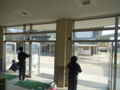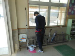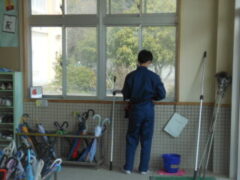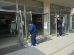紀北支援学校高等部のクリーン班の生徒さんが、三田小学校の児童玄関の窓清掃に来てくれました。紀北支援学校高等部では作業学習として、6つの作業班に分かれて、地域との連携を深め、地域で必要とされる存在であることを実感しようと活動しています。その一つクリーン班が今回窓清掃に来てくれました。1時間と限られた時間での活動でしたが、生徒さんたちは黙々と真剣に清掃作業をしてくれました。運動場からの砂で窓やサッシがかなり汚れており、たいへんだったようです。蜘蛛の巣とりやT字型のモップ状になっているもの、ゴムのワイパーのようなものなどを使って、玄関の大きなガラスも上の方の高い窓も、とってもきれいになりました。クリーン班の皆さん、児童玄関が明るくなりました。ありがとうございました。