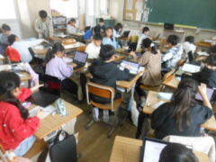 道具のひみつを調べて伝える単元です。子どもたちは、お金や時計、こたつなどの道具の移り変わりについて、タブレットを利用して調べています。お金については、銭や厘という単位があったことや、もっと昔には「寛永通宝」というお金があったことなど、こたつでは、室町時代囲炉裏にやぐらを組んで布をかぶせていたのが発祥だということを調べていました。どんなにまとめられるのか楽しみです。