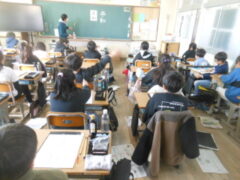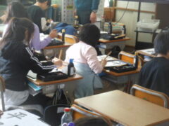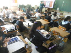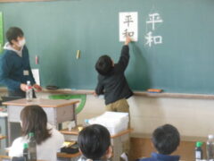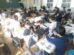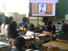 「平和」という文字を毛筆で書きます。まず、お手本を見て気づくこと、書くときに注意することをあげていきます。「平」は縦長のひし形に入る形だとか、左右の位置が「平」の4画目の一番左端と「和」の1画目のはらいの先が同じになっているとか、「和」の2画目は右が1、左が3くらいの長さに分かれているだとか、他にもたくさん出ました。そしてモニターで上手な人が実際に書いている動画や筆先だけに赤い色を付けて書いている動画を見て、筆のおき方を見たりしました。「和」の口の部分の最後の画の重なりに注意すること、「和」の禾の部分の5画目は2画目とすこしはなして書くなどは、先生から教えてもらいました。そしていよいよ練習に入ります。みんな真剣な表情です。力作がたくさんできることでしょう。
