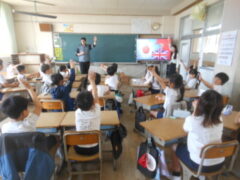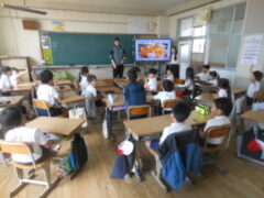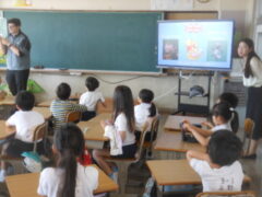 また、今年度もALTはアンガス先生が担当してくれます。二人で楽しい授業をしてくれました。日本の食べものやキャラクターとアンガス先生のふるさとイギリスの食べものやキャラクターをくらべていました。3年生たちも、ノリノリで、楽しく授業を受けられていました。