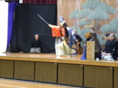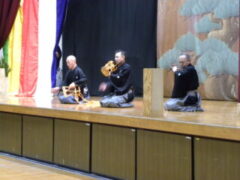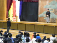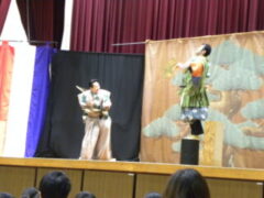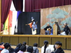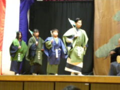 全校児童を対象に日本の伝統芸能の「能」について、能楽堂嘉祥閣という団体の方に教えてもらいました。はじめに、男性の先生に実際の衣装(平敦盛の衣装)を着せてくれているところを見ながら、能のことについて教えてもらいました。また、各学級一人ずつに、お面をかざしながら、お面の説明をしてもらいました。一番怖かった般若の面をはじめ、いろいろな種類のお面があることも知りました。そして、「うた」と「まい」の練習をしました。次の日に実際に本公演を見せてもらうことになっているのですが、その時に参加できるように教えてもらいました。子どもたちはとても興味深く取り組んでいました。本公演が楽しみです。
