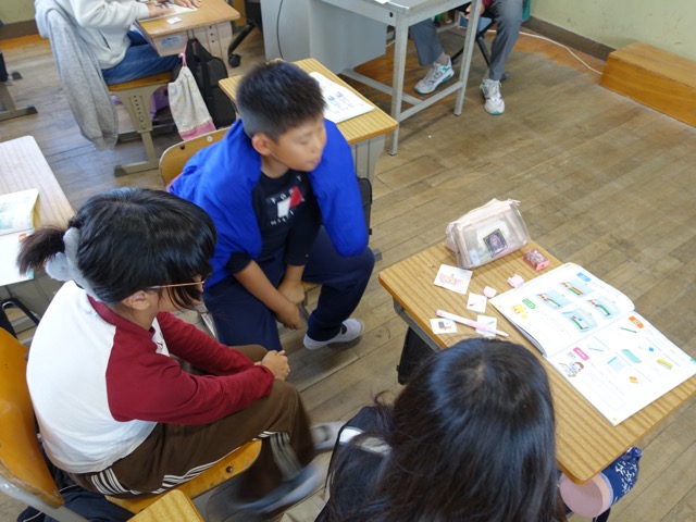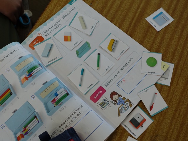 ALTの先生に、話し合ってまとめた文具を紹介。