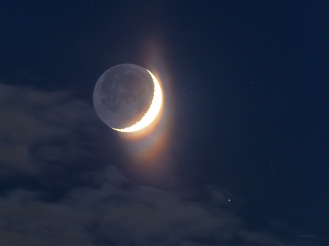 今夜は五日月でしたが、各地で綺麗に見えたようです。写真は五日月と月光輪と彩雲の一種だそうです。ほんの一瞬の表情。素敵ですね。
