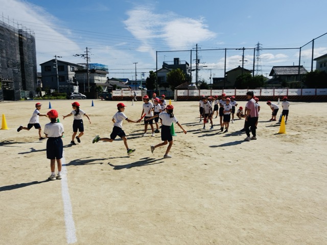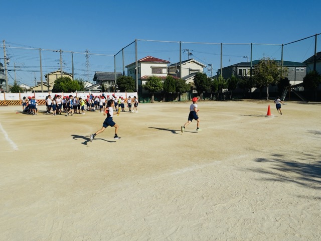 ※5年生、久しぶりの運動場体育。リレーの練習中!上手く走者に繋いでいこうな!